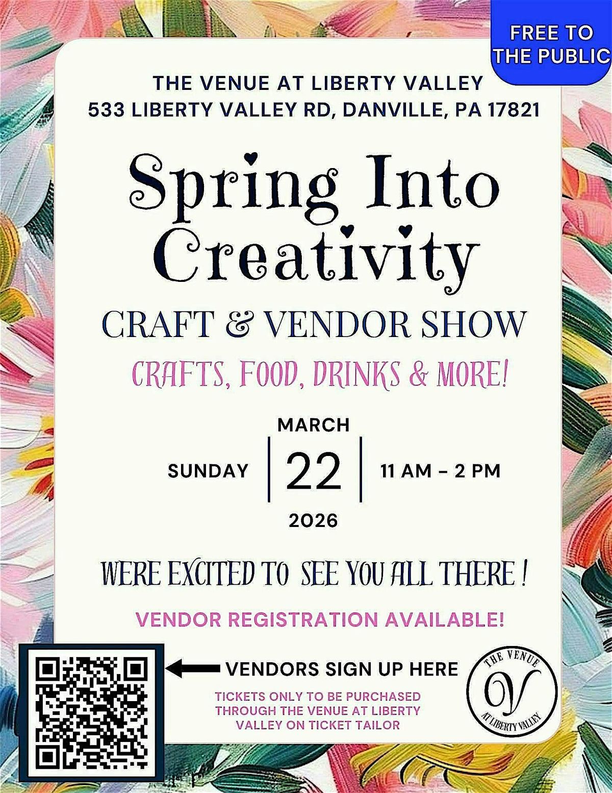 Mark your calendars and join us for a fun-filled afternoon celebrating creativity and community! Our Spring Into Creativity Craft & Vendor Show is FREE and open to the public, so bring your friends, family, and loved ones along.Enjoy browsing a variety of local vendors and handmade goods, grab some food and drinks, and soak in all the spring vibes. Handmade is truly the best way to go—with amazing pricing on unique gifts perfect for Easter, Mother’s Day, and more.Come out to support our incredible local makers, find something special, and enjoy a relaxed Sunday with us. We are handicap accessible!We can’t wait to see you there and celebrate all things local, creative, and handmade