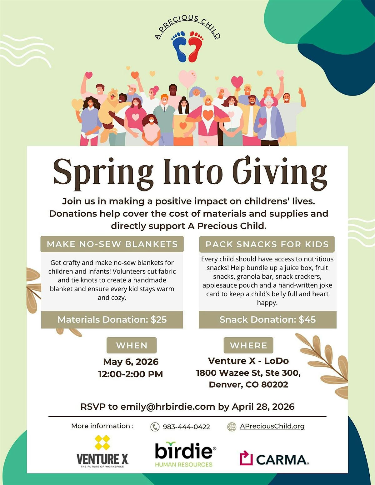 Join us for Spring Into Giving, a hands-on volunteer event benefiting A Precious Child, a local nonprofit supporting children and families across the Front Range.