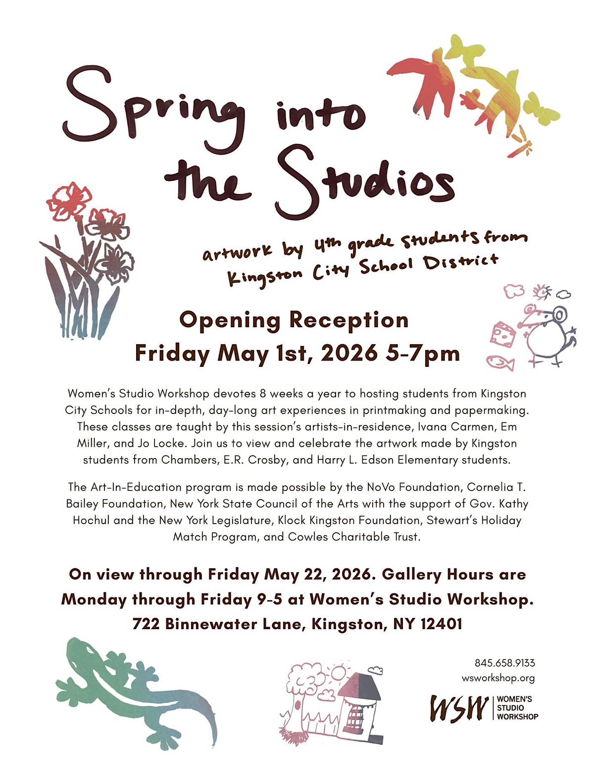 Women’s Studio Workshop devotes 8 weeks a year to hosting students from Kingston City Schools for in-depth, day-long art experiences in printmaking and papermaking. These classes are taught by this session’s artists-in-residence, Ivana Carmen, Em Miller, and Jo Locke. Join us to view and celebrate the artwork made by Kingston students from Chambers, E.R. Crosby, and Harry L. Edson Elementary students.
