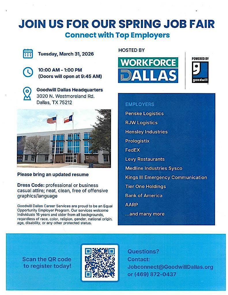 Looking for new opportunities? Join us in person at the Spring Job Fair hosted by Workforce Dallas and Goodwill Industries of Dallas! Connect with awesome employers, explore exciting jobs, and take a step forward in your career. Don’t miss out on making valuable connections and discovering your next gig – it’s all happening live, so come ready to engage and grow!