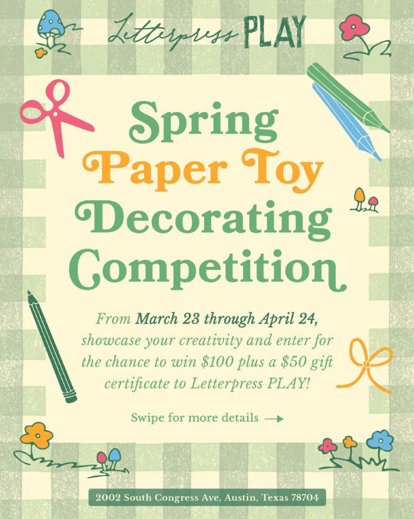 Pick up your paper toy decorating pack from 2002 S. Congress Ave or order online today! To order and ship your paper toy pack free of charge, click here. https://letterpressplay.com/en-ca/products/2026-spring-paper-toy-decorating-competition-pack