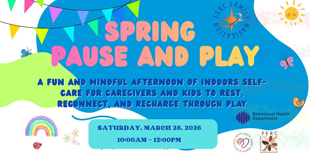 Come join us for a fun-filled event where you can pause your busy life and just play! This in-person gathering will be a mindful afternoon of self-care for caregivers and kids to rest, reconnect, and recharge. Held at our FERC Oakland office 7677 Oakport St suite #100 and hosted by the FERC Family Navigation Reentry Program. Get ready to relax, unwind, and enjoy some quality time with your loved ones. Don't miss out on this opportunity to take a break from your daily routine and have some well-deserved fun. See you there!