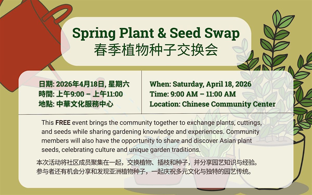 This FREE event brings the community together to exchange plants, cuttings, and seeds while sharing gardening knowledge and experiences. Community members will also have the opportunity to share and discover Asian plant seeds, celebrating culture and unique garden traditions.
