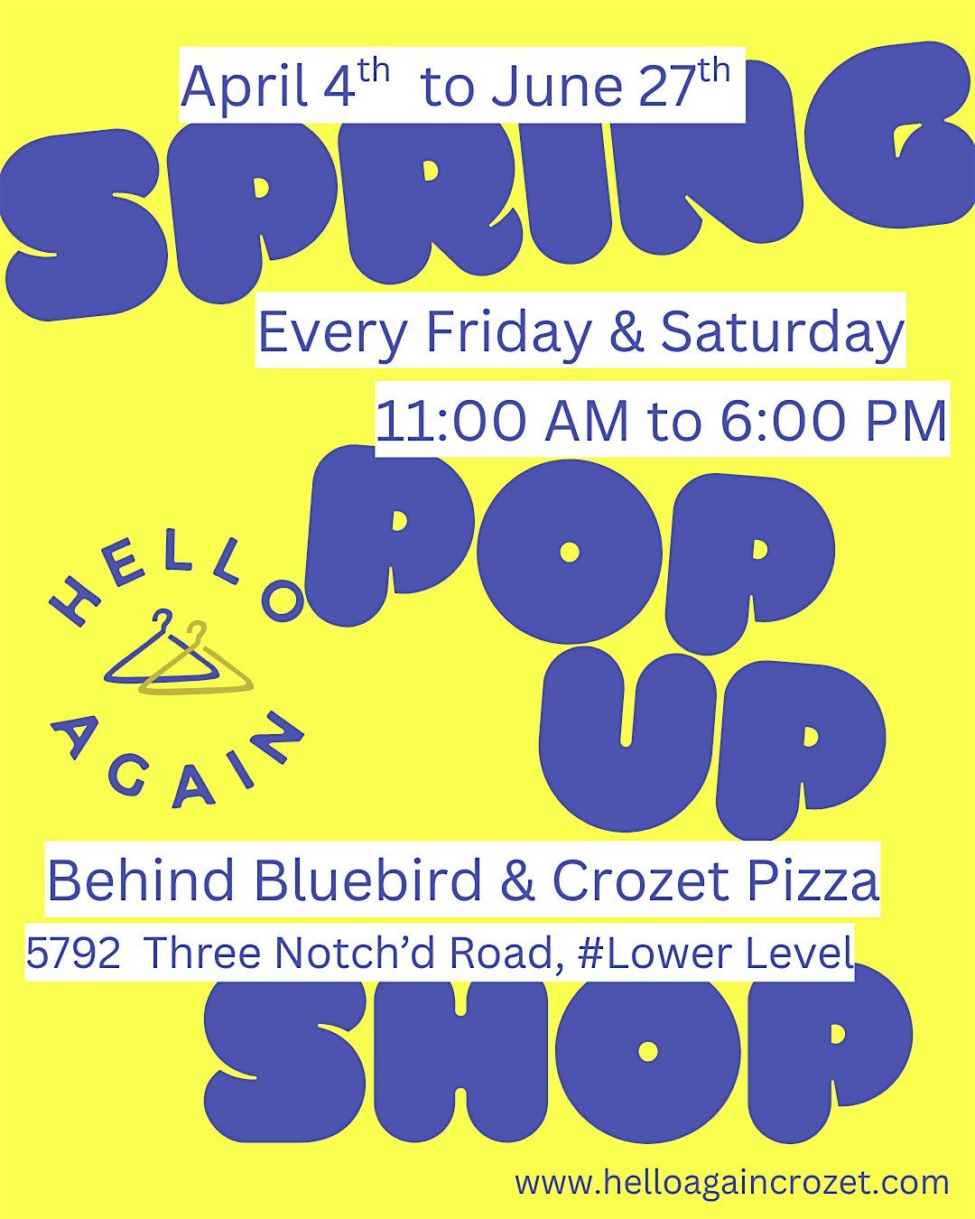 It's Hello Again's first long-term pop-up shop! Inventory changes weekly. Parking is available behind Bluebird and Crozet Pizza. Consignment appointments are available!