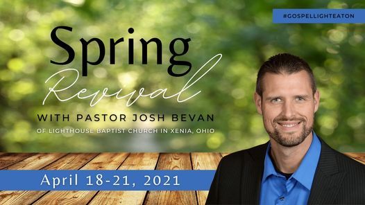 Invite your friends and family and join us for our Spring Revival with Pastor Josh Bevan of Lighthouse Baptist Church in Xenia, Ohio!SERVICE SCHEDULE: