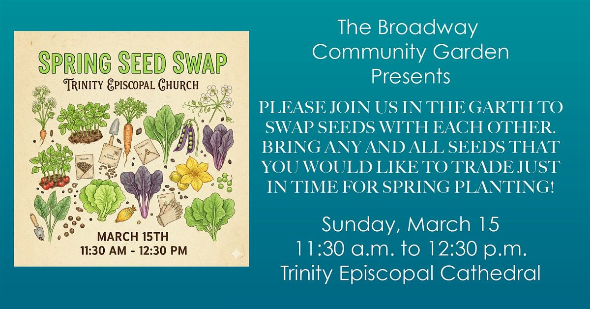 Please join us in the Garth to swap seeds with each other. Bring any and all seeds that you would like to trade and hopefully we will have a wide selection to “swap” just in time for spring planting!
