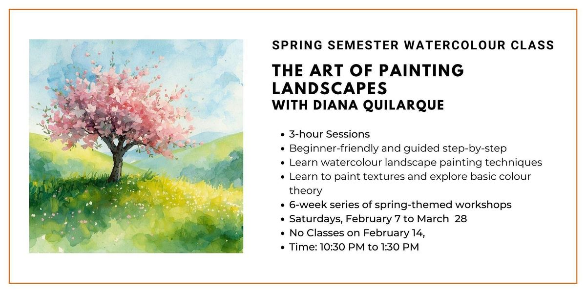Each session focuses on a unique spring-themed scene, from blooming flowers and budding trees to sparkling streams and soft skies. You’ll learn essential watercolour techniques such as layering, wet-on-wet, dry brush, and controlled washes while exploring composition, texture, and colour harmony.