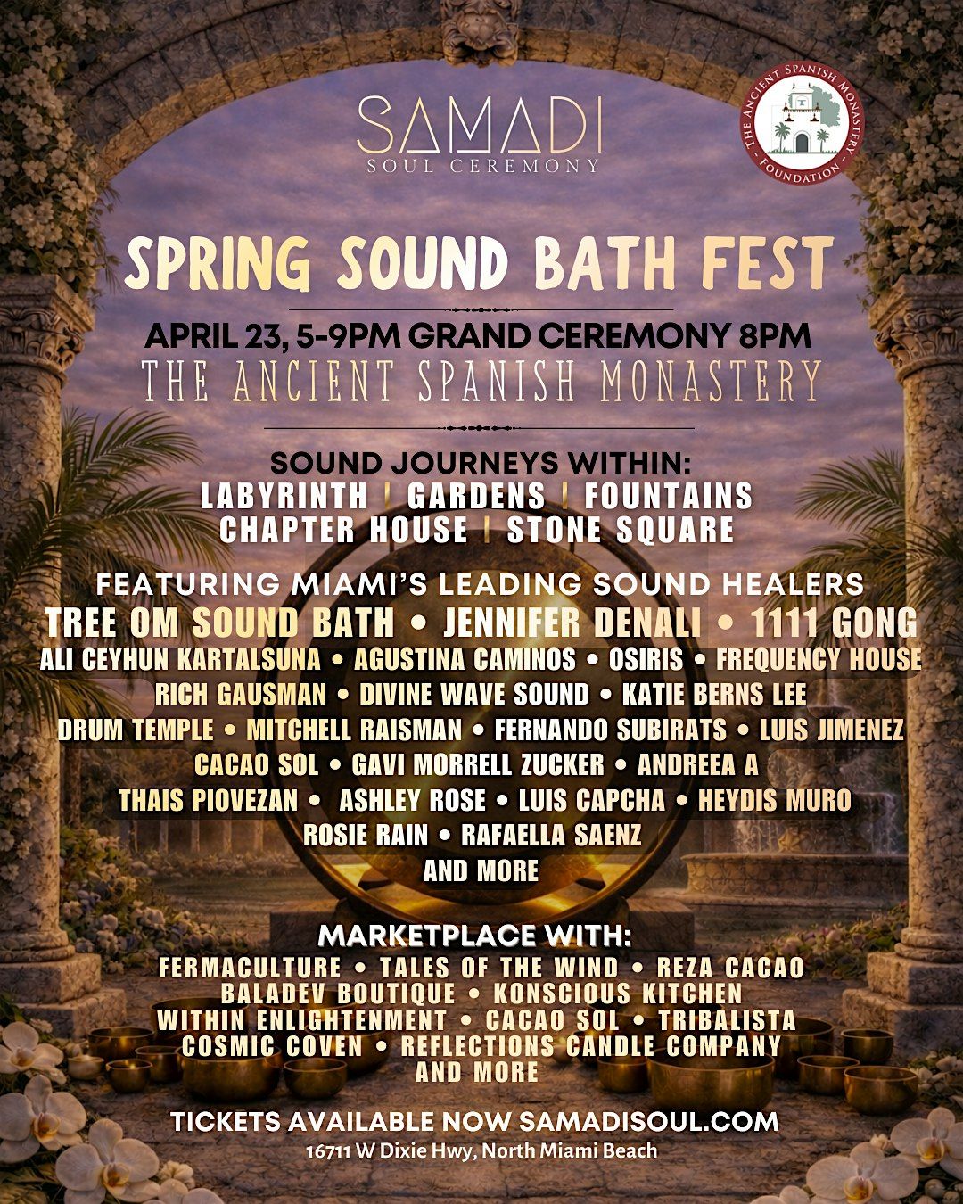 Miamiβs first-ever Sound Bath Festival at the historic Ancient Spanish Monastery. From 5:00β8:00 PM, experience Sound Baths in the Labyrinth, Sculpture of Light park, Fountains, and Chapter House.