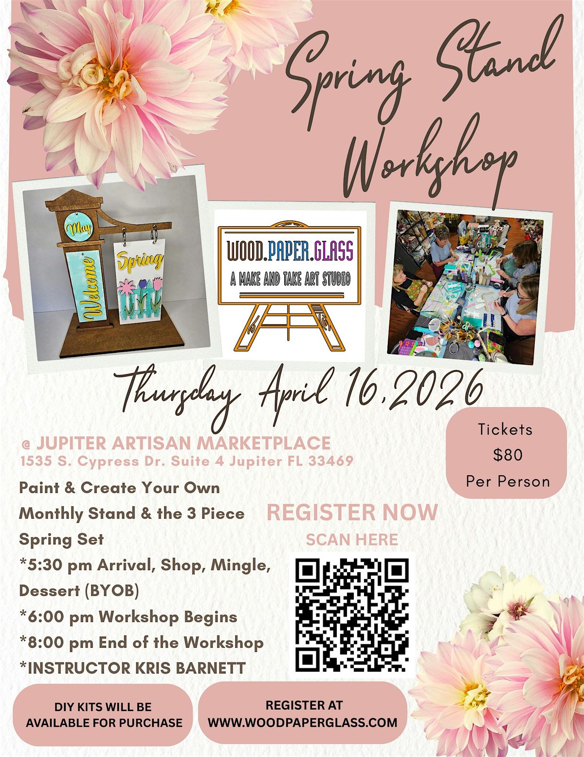 Join us at Jupiter Artisan Marketplace (1535 S Cypress Dr, Suite 4, Jupiter, FL 33469) for the Spring Monthly Stand workshop. Learn the step-by-step process of painting and assembling with detailed instructions. All supplies and instructions are included. You will bring home your finished piece ready to display. BYOB.
