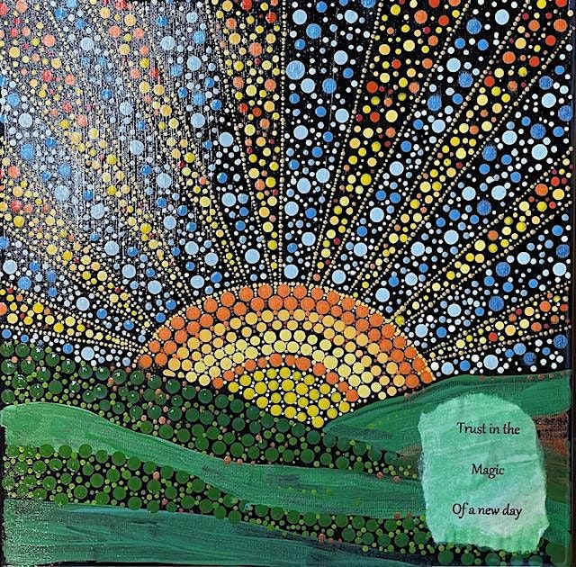 Join us for a relaxing and joy-filled 2‑hour painting class where you’ll create a vibrant Spring Sunrise using simple, colorful dots of paint. I’ll guide you step-by-step as we build a glowing sky, rising sun, and soft landscape through an easy, meditative dot technique—no prior art experience needed.