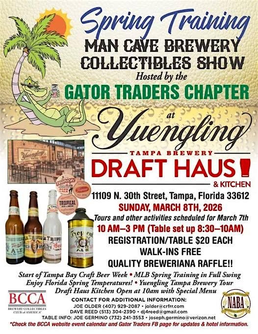 You're invited to the Spring Training Man Cave Brewery Collectibles Show hosted by The Gator Traders Chapter and sponsored by the Yuengling Brewery on Sunday March 8th at the Yuengling Brewery Draft House. Walk-ins are free but if you'd like a table or want to attend any of the Saturday events, please fill out the registration form and mail it out. We simply are trying to track how many will be attending the events.
