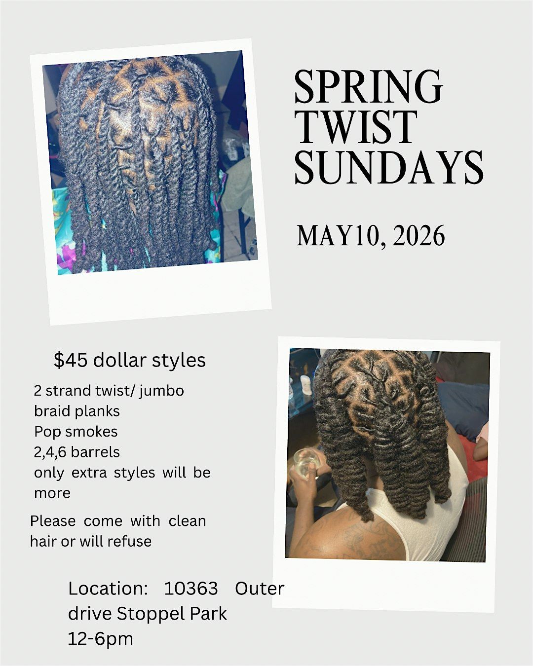 Spring Twist Sundays is a laid-back, community-style hair event where you can come get fresh, protective styles at an affordable price. Whether you’re preparing for the week or just want to feel good and put together, this is your space to relax, connect, and leave styled.
