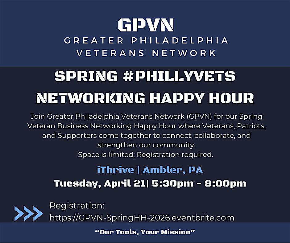 Join Greater Philadelphia Veterans Network (GPVN) for our Spring Veteran Business Networking Happy Hour where Veterans, Patriots, and Supporters come together to connect, collaborate, and strengthen our community.