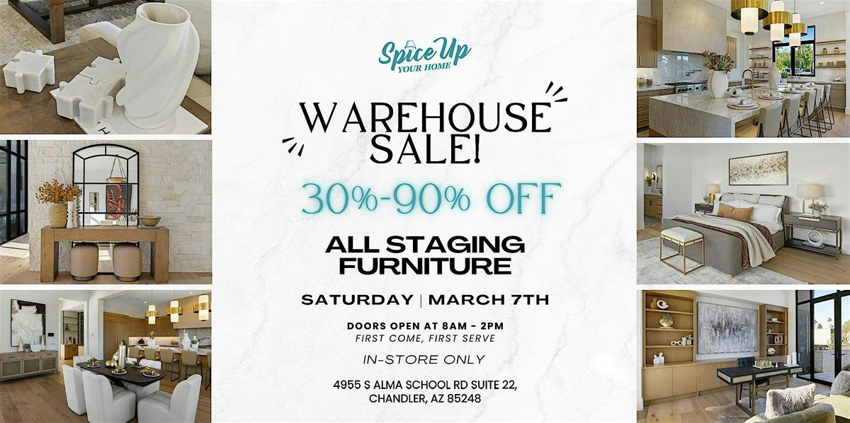 Join us Saturday, March 7th for our exclusive one-day Warehouse Sale, featuring 30–90% off luxury staging furniture and décor.