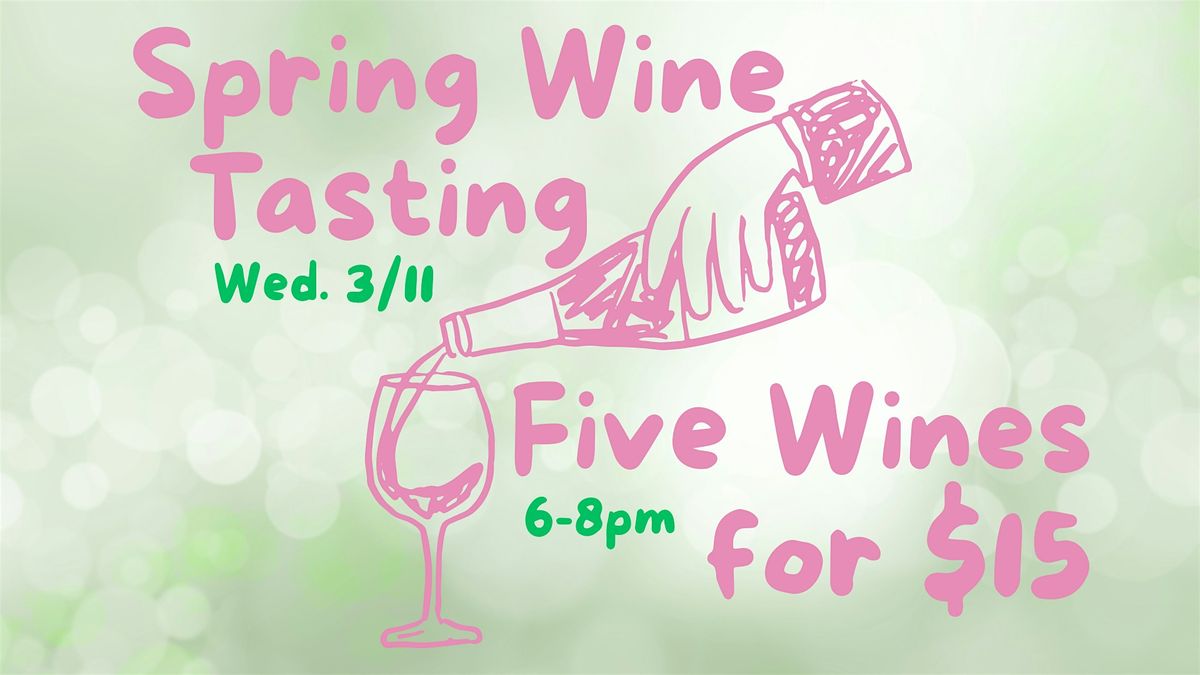 Spring on over for a fresh new Wine Tasting with Ken. Featuring a sneak peek of our new seasonal wines that will be added to our menu!! Five wine pours for $15, or FREE with purchase of a bottle from the tasting! Come find your new favorite wine!