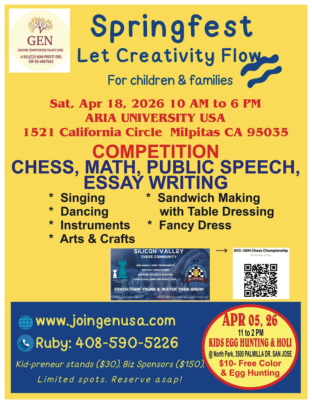 On Sat, Apr18, 2026 -10 to 6 PM @ ARIA UNIVERSITY, 1521 California Circle Milpitas, Competition for CHESS, MATH, PUBLIC SPEECH, SINGING