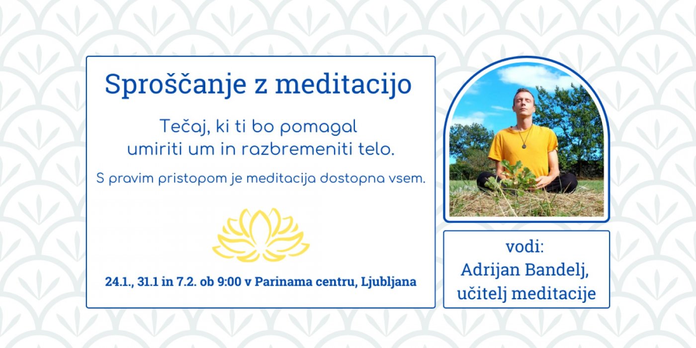 👍Pridruži se tridelnemu tečaju Sproščanje z meditacijo, kjer boš odkril/a, kako se pravilno pripraviti na meditacijo, da bo le-ta udobna, prijetna in učinkovita. Vse vaje bodo prilagojene tvojim trenutnim zmožnostim, v osnovi pa niso zahtevne.