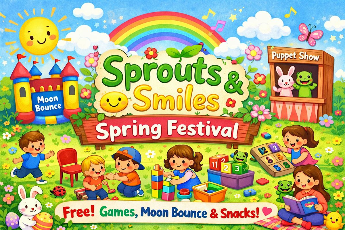 Join us for a joyful day of family fun at our Sprouts & Smiles Spring Festival! This community-friendly event is packed with laughter, learning, and springtime excitement for little ones and their families. Enjoy FREE hot dogs and chips, a moon bounce, and interactive activity stations including musical chairs, coloring and sorting, a build-a-tower challenge, name recognition fun, sensory bin exploration, shape hop, counting toss, and a cozy story time & puppet corner.