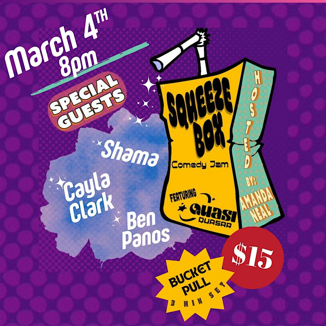 Squeeze Box Comedy Jam is a monthly showcase hosted at Swanson's Warehouse the first Wednesday of every month by comedian Amanda Neal.