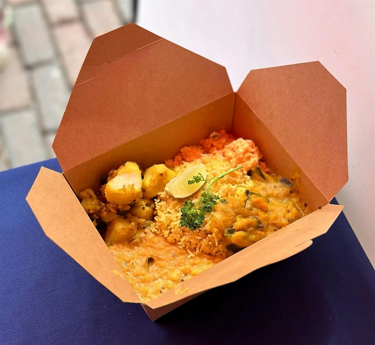 Each delicious Sri Lankan lunchbox contains tumeric rice, coconut sambol, dahl curry (red lentils), tempered potatoes, and the curry of the day! All food is vegan and gluten-free.