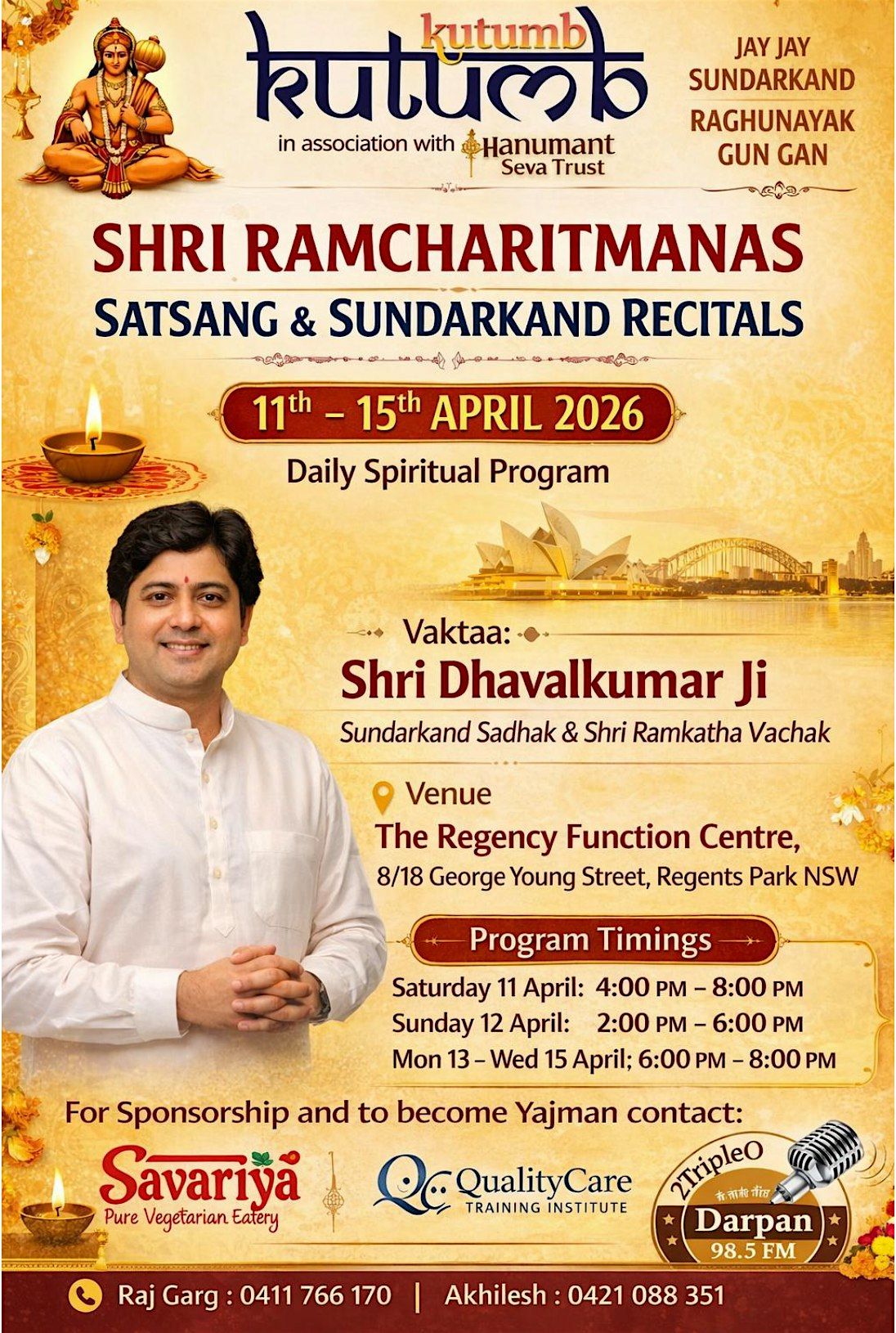 Satsang by renowned Shri Dhavalkumar on various topics and characters of Shri Ramcharitmanas followed by Shri Sundarkand Path over 5 days.About this Event