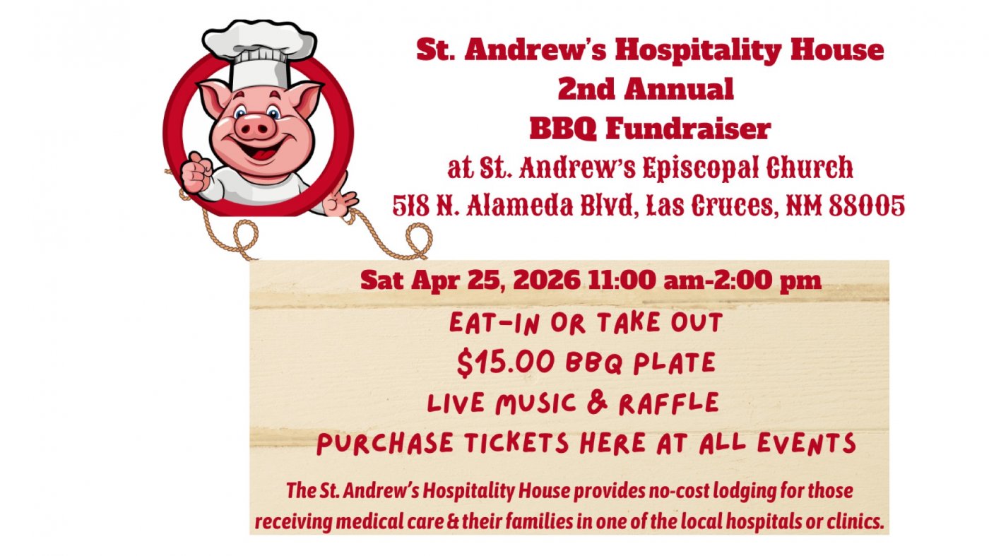 Join us for the St. Andrew's Hospitality House 2nd Annual BBQ Fundraiser! BBQ plates are $15.00, and include a Pulled Pork BBQ sandwich, Corn, Beans, and a Dessert. You can eat in the Parish Hall at St. Andrew's Episcopal Church or take it home to enjoy with your family! We will have Live music and a raffle! (You do not need to be present to win.) Buy your tickets online today!