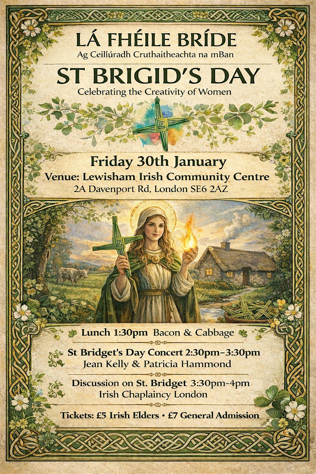 Lewisham Irish Community Centre invites you to join us in celebrating St Brigid's Day. It will be an afternoon of traditional Irish food, music and discussion. The perfect way to connect with member of the local community, enjoy Ireland's cultural heritage and soak up the festive vibe. Whether you're familiar with the traditions or just curious, everyone’s welcome! Don’t miss out on the chance to be part of this lovely celebration.