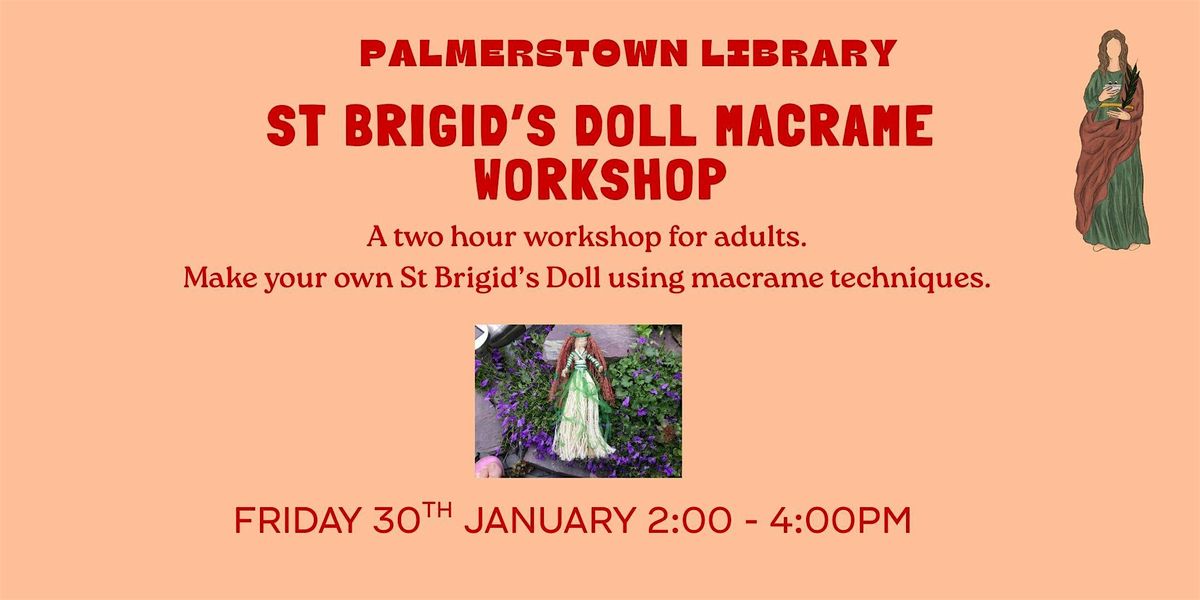 Welcome to the ST BRIGID'S DOLL MACRAME WORKSHOP for adults at Palmerstown Library! Join us on January 30, 2026 at 2:00 PM for a fun and creative session. Learn the art of macrame and create your very own St Brigid's Doll. No experience needed, just bring your enthusiasm! Don't miss out on this opportunity to unleash your creativity and meet new friends. See you there!