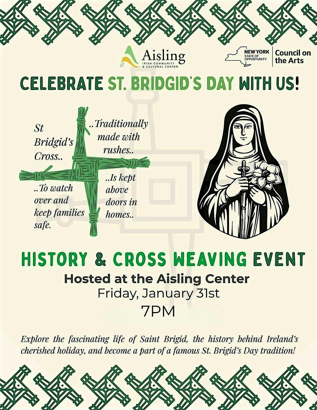 St. Brigid's Day is widely celebrated in Ireland - you'll find her woven cross in primary schools, homes, and workplaces. Join us to learn of St. Brigid's facinating life, create your own woven rush cross, and become part of a tradition from all the way across the water. The event will take place Friday, January 31st at 7PM, right here at the Aisling Center.