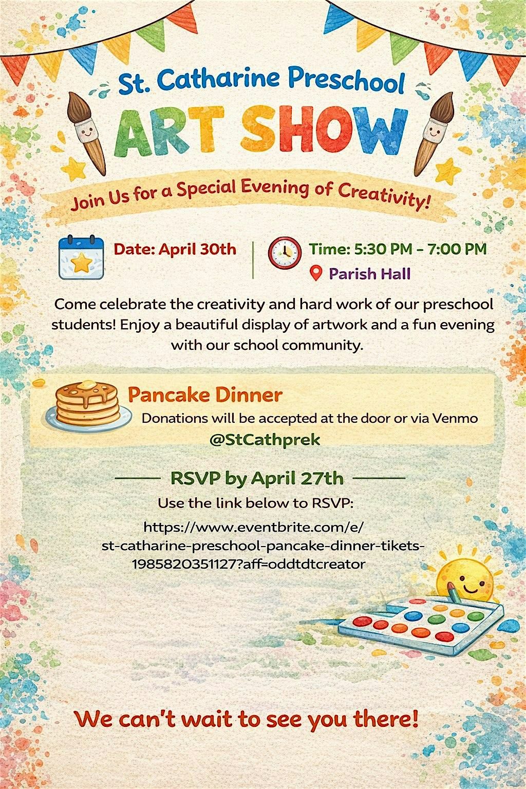 Please join us for an all-you-can-eat pancake dinner presented by Chris Cakes on April 30th from 5:30pm-7:00pm