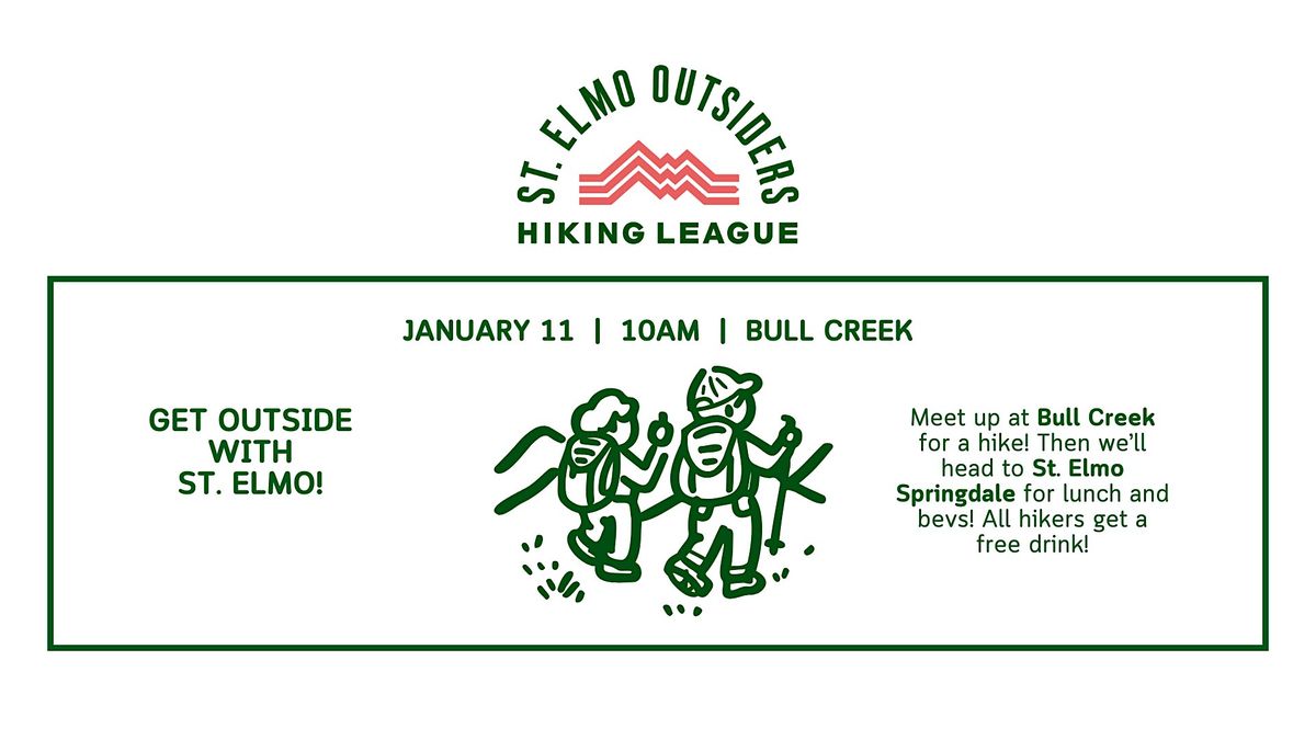St. Elmo Brewing's Outsider League hike is back -- join us for a fun stroll at Bull Creek! Look for the St. Elmo employee who will guide you during the hike. We will drink some refreshing Hop Water before heading back to St. Elmo Springdale (8110 Springdale Rd) and having a couple beers and some lunch from the food trucks!