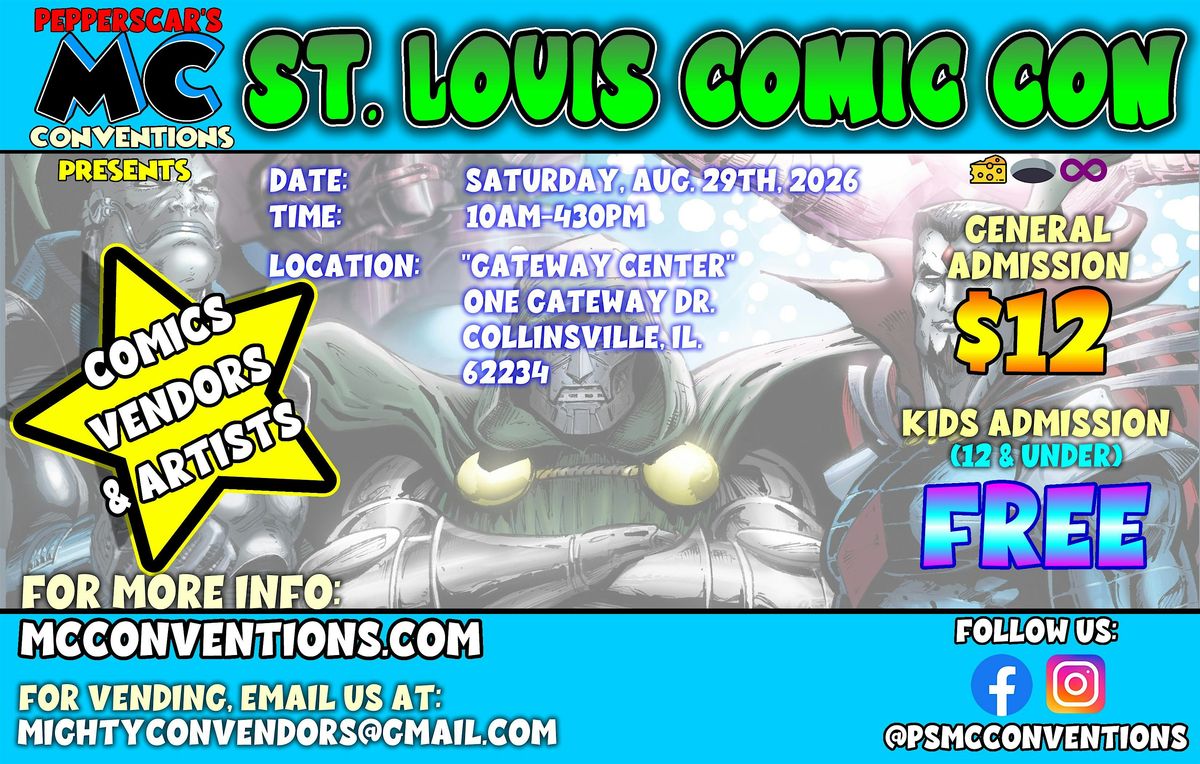 We return to the Gateway center with the long running St. Louis area Comic Con! Family Friendly! Comics! Toys! Artists! Guests! And more!About this Event