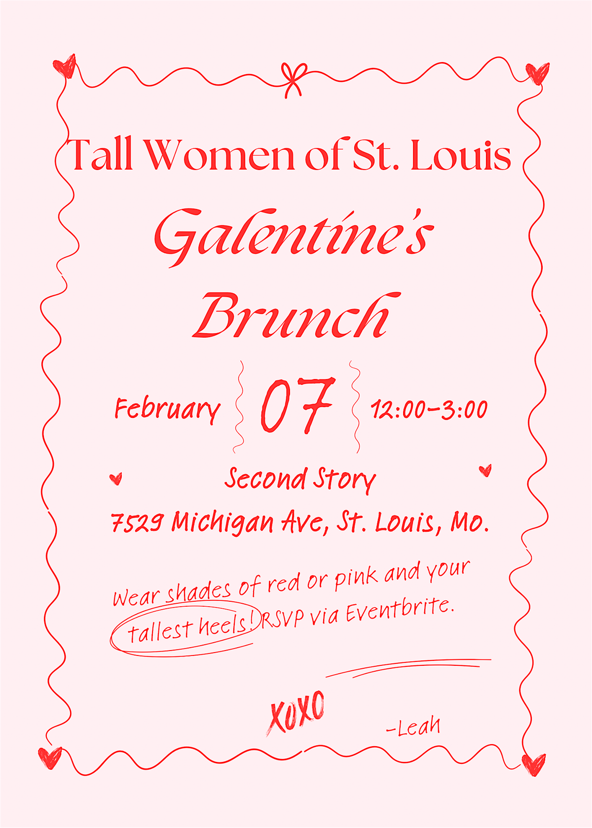 Come join us for a fun in-person Galentine's Day brunch made just for tall women in St. Louis! It's all about celebrating friendship, laughter, and great vibes with ladies who are just as tall as you. Whether you're sipping mimosas or sharing stories, this brunch is the perfect way to spend your Galentine's Day!