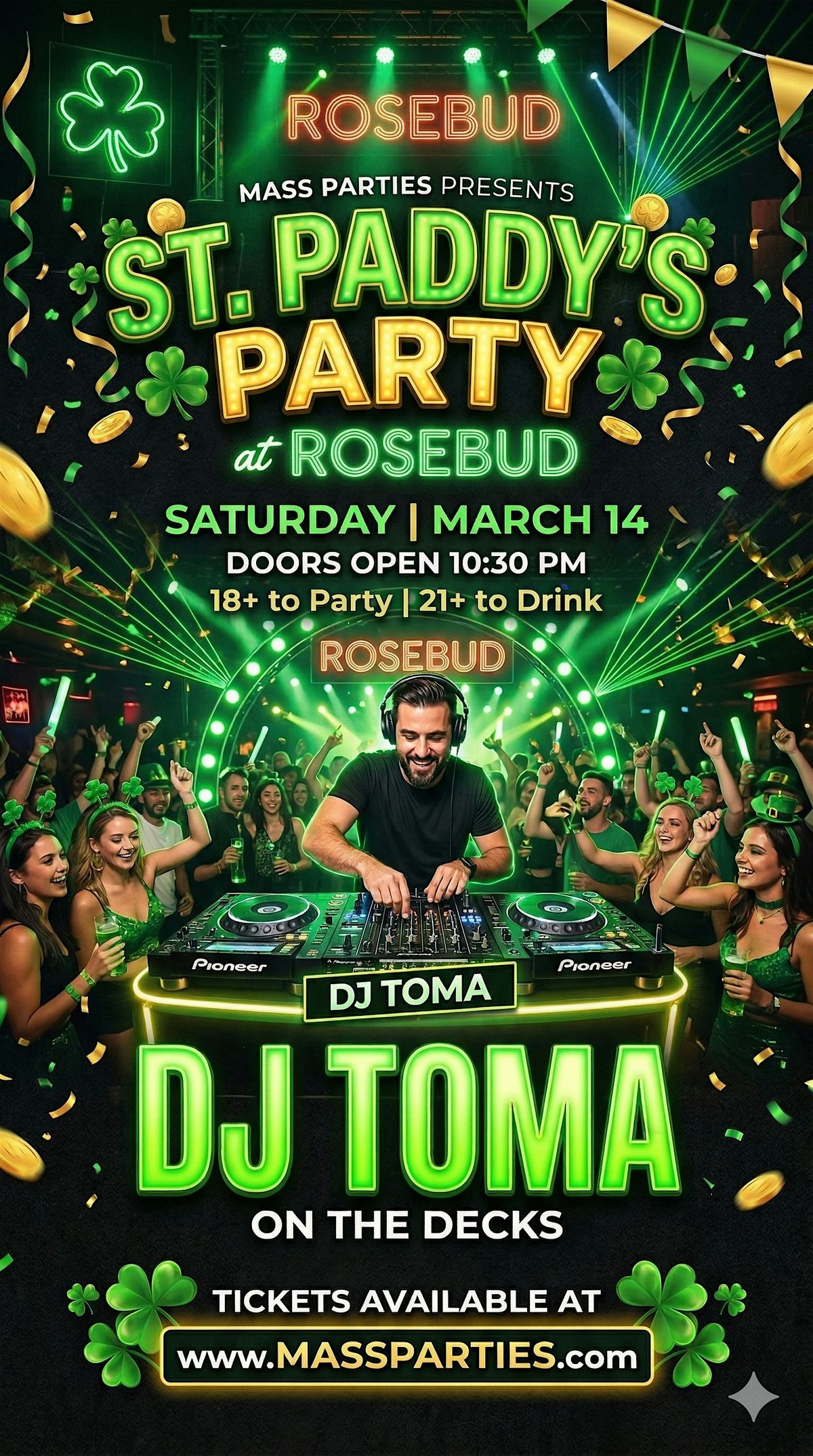 Mass Parties is taking over one of the most iconic spots in town for a night of neon green lights, high-energy vibes, and non-stop music. We’re bringing in the heavy hitter—DJ TOMA—to be on the decks all night long, spinning a mix of Top 40, Hip Hop, and House that’ll keep the dance floor packed until the early morning.