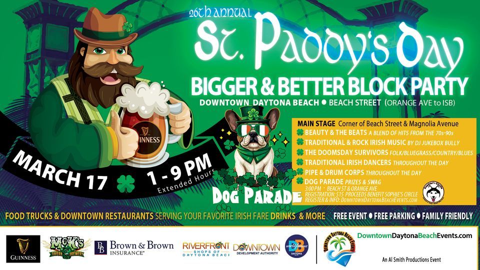 Wear green and join the fun of this beloved annual block party in Downtown Daytona Beach. Enjoy Irish food and drink, live music, a dog parade, and more at this family-friendly event! MAIN STAGE