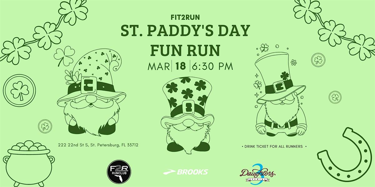 Join us for a St. Patrick's Fun Run with Fit2Run at 3 Daughters Brewing on Wednesday, March 18th at 6:30pm with a demo run from Brooks! Relaxed run with runners of all paces welcome with a complimentary drink from 3D awaiting your finish!
