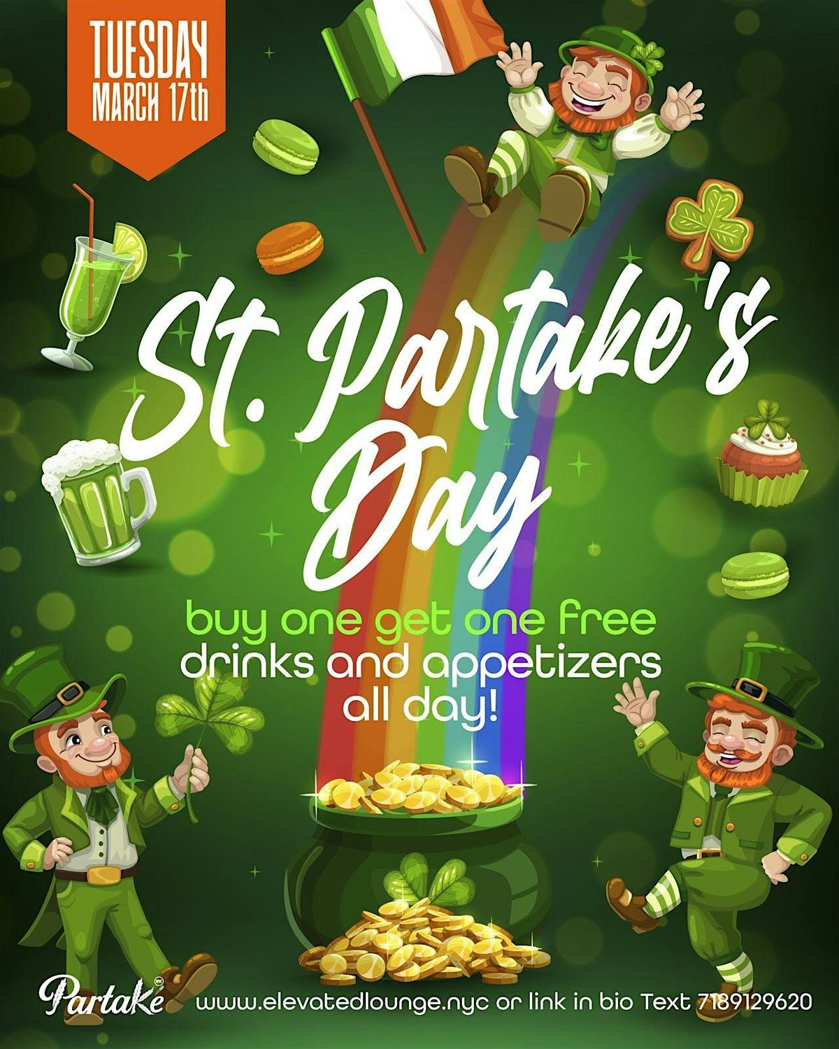 St. PARTAKES DAY IS OUR TWIST ON ST PATRICKS DAY AND ITS A DAY FOR EVERYONE TO GET LUCKY BECAUSE WE GOT ALL DAY BUY ONE GET ONE FREE DRINKS AND APPETIZERS!