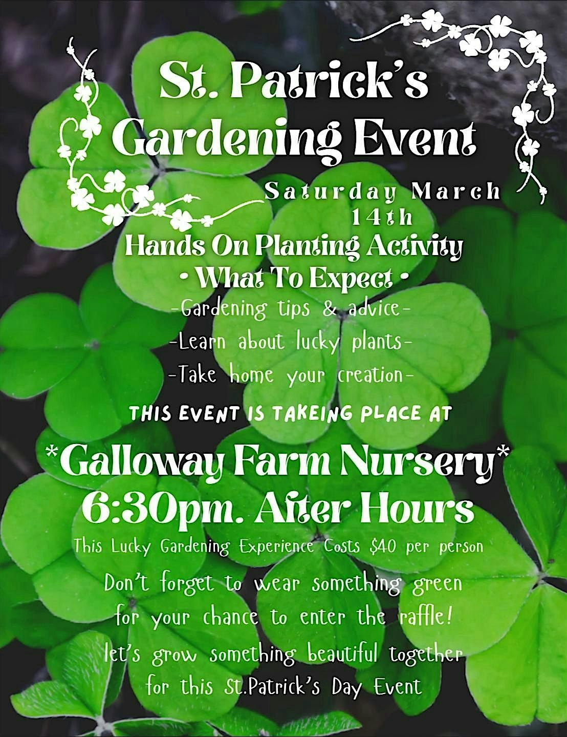 Get ready to get your hands dirty while creating an experience to remember! you'll be able to choose between two types of lucky plants and select a pot that fits you best, toppin it off with some different choices for rock decoration. Let's grow something beautiful together for this St. Patrick's gardening event! Don't forget to wear something green so you can get a chance to enter the raffle for your chance to win a $25 dollar Galloway gift card.