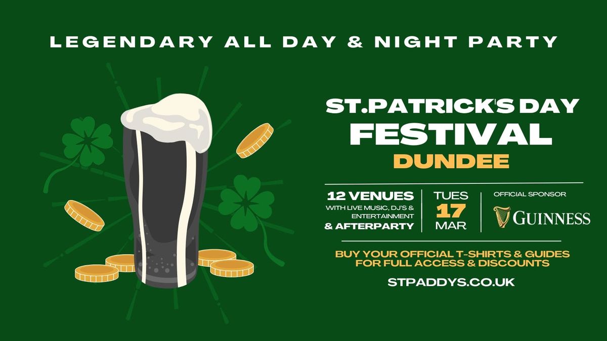 DUNDEE'S BIGGEST ST PATRICK'S DAY + NIGHT PARTY! FEATURING LIVE MUSIC, ENTERTAINMENT, DJ'S & DISCOUNTS AT 12OF YOUR FAVOURITE VENUES. GET FULL ACCESS & UNLOCK ALL DISCOUNTS WITH YOUR OFFICIAL 'ST PATRICK'S DAY FESTIVAL' T-SHIRT - INCLUDING FREE ENTRY TO OUR OFFICIAL AFTERPARTY AT DUNDEE'S FAVOURITE NIGHTCLUB!