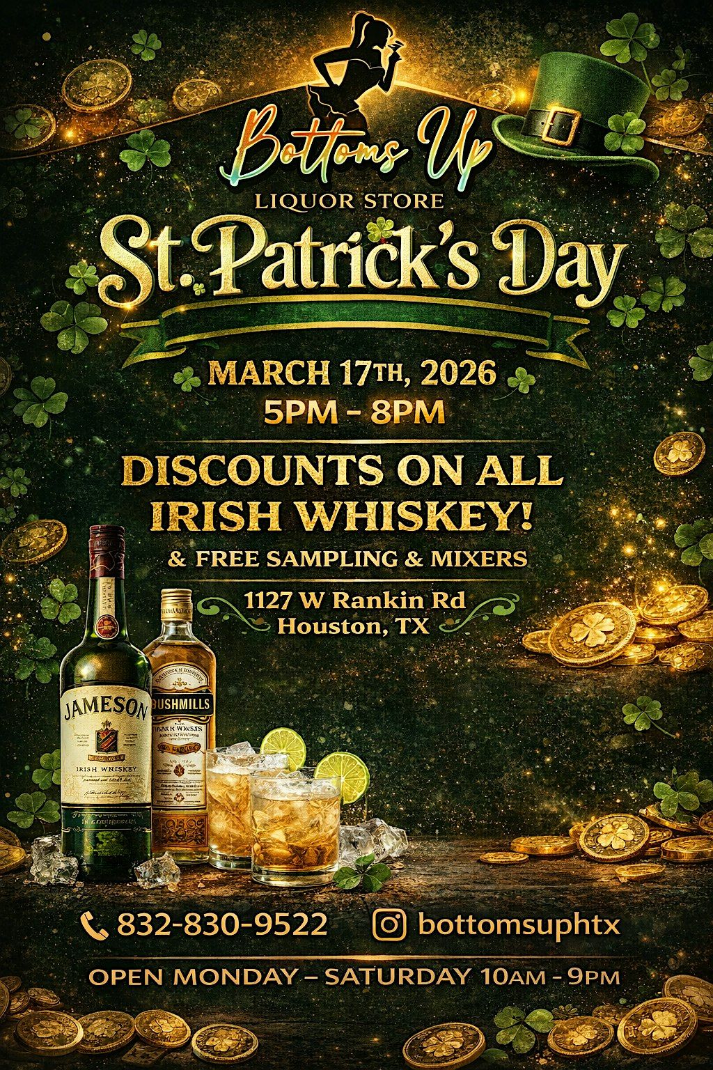 Celebrate St. Patrick's Day with a fun, in-person tasting at Bottoms Up Liquor Store! Sip on a variety of authentic Irish whiskeys, learn some cool facts, and enjoy great company. Whether you're a whiskey pro or just curious, this event is the perfect way to get into the Irish spirit. Don’t miss out on this awesome chance to explore bold flavors and make new friends! ($5 OF TICKET PRICE IS REDEEMABLE TOWARDS ANY BOTTLE IN STORE!)