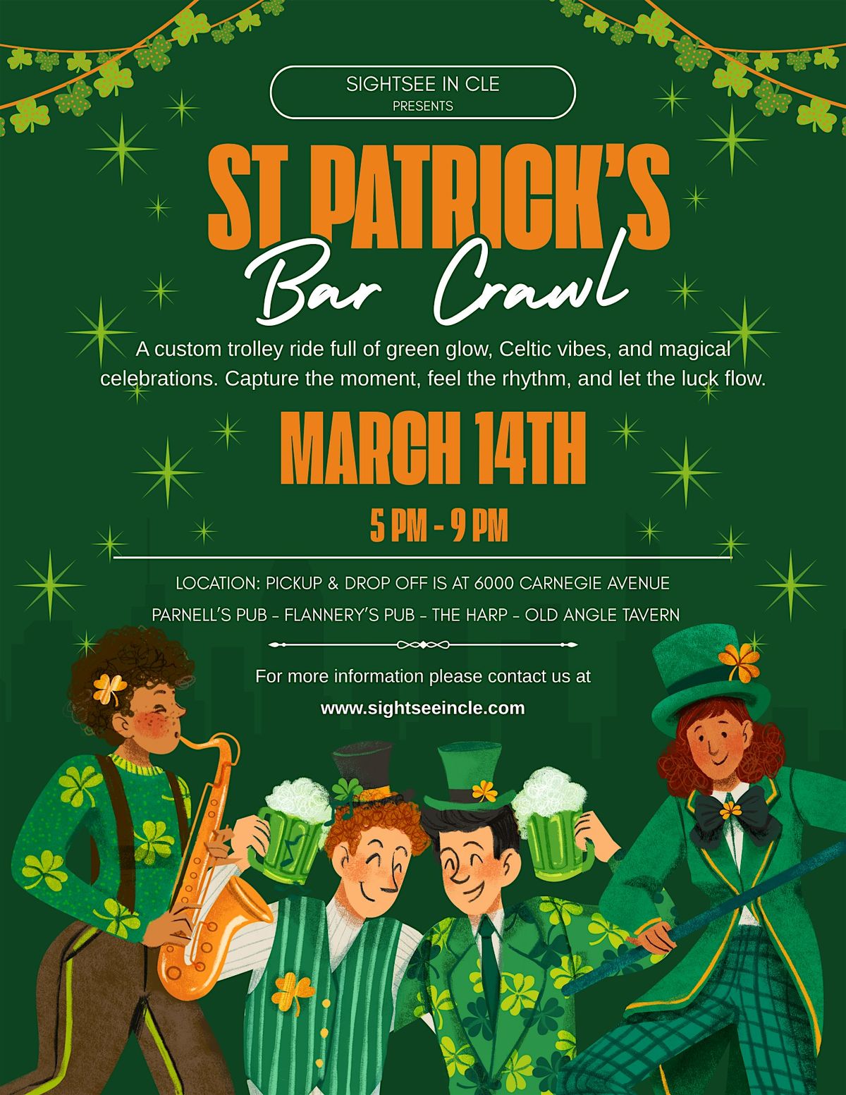 Hop aboard our St. Patrick’s Day Trolley Tour with pickup and drop-off at 6000 Carnegie Ave (free parking included — easy in, easy out).