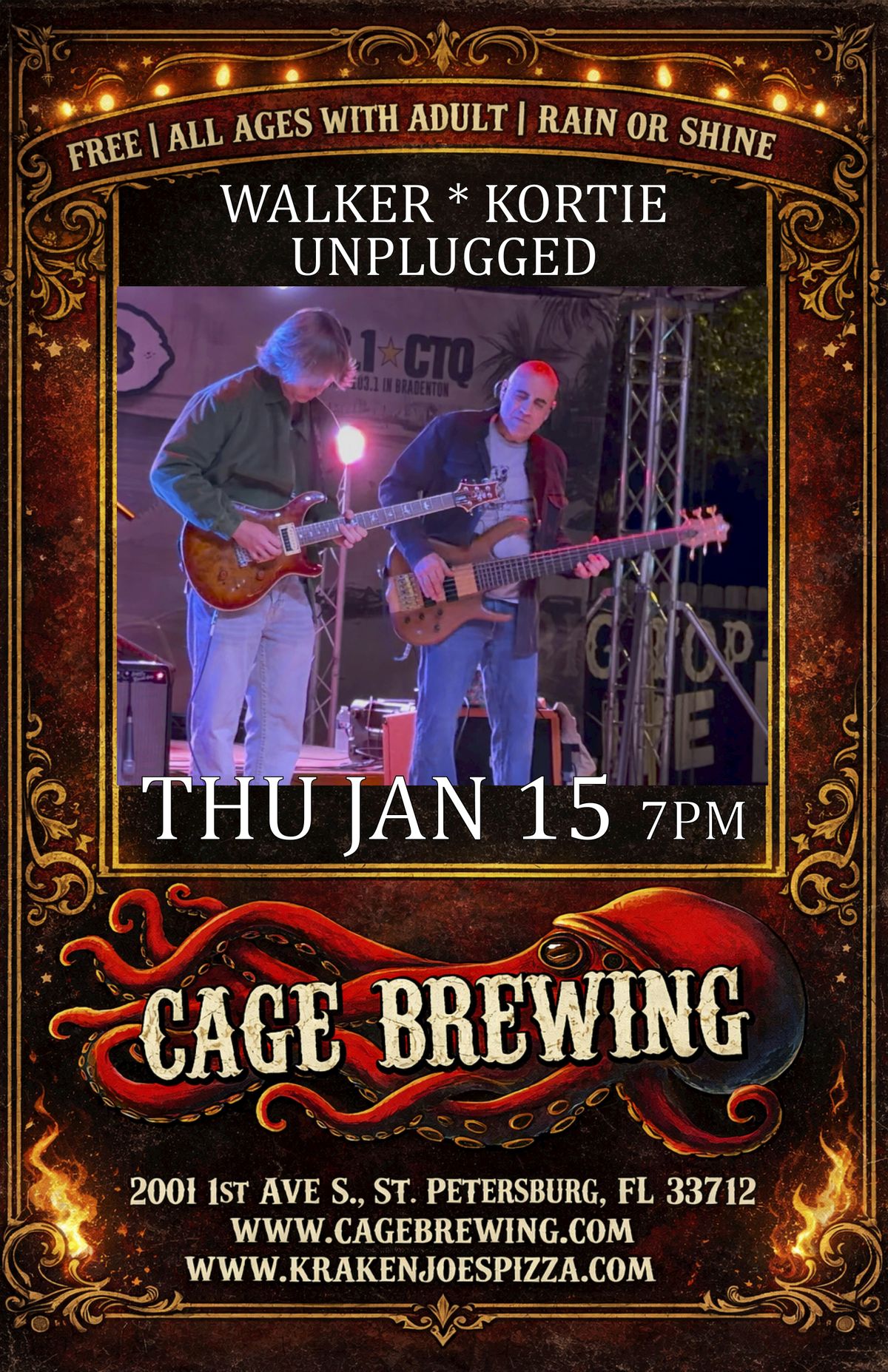 Come join us for a night of music with Christian Walker (Dead Set Florida, Morning Dew) & 18 y/o guitar prodigy Steven Kortie (Grateful Walker Family Band) at Cage Brewing! Get ready for an evening filled with great tunes and good vibes. This event is free entry, so bring your friends and let's have a blast together. See you there!