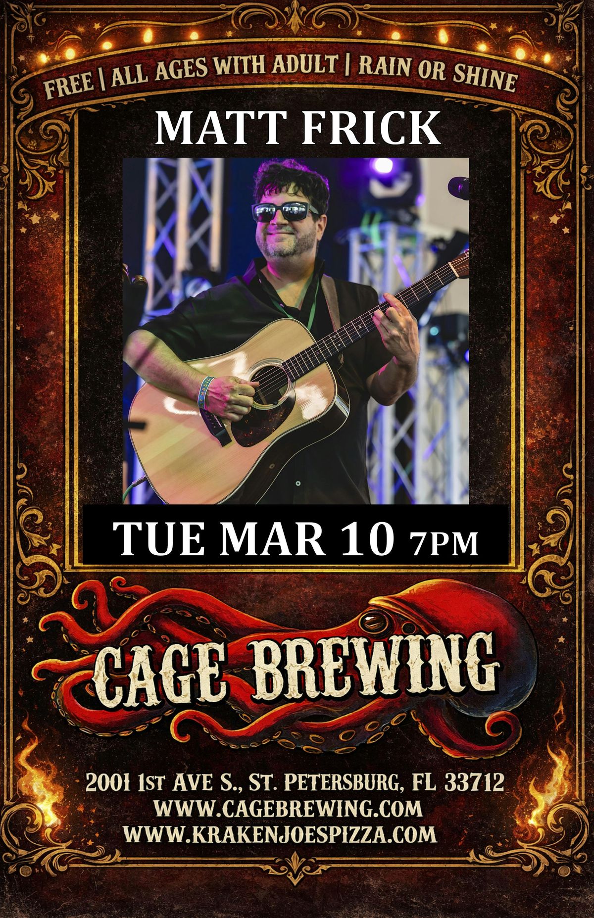 Join us at Cage Brewing for a night of great tunes with Matt Frick live in person! Come enjoy the vibes, good drinks, and awesome music starting at 7pm. It's the perfect way to spend your evening in St. Pete – don't miss out!