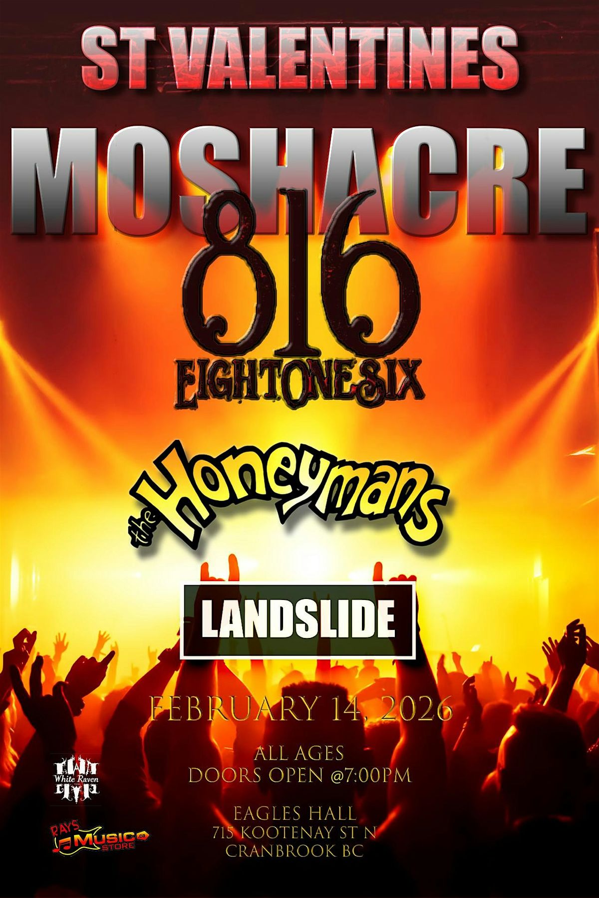 Come join us at The Eagles Hall 715 Kootenay St N for a night of love, music, and moshing! Get ready to rock out with your loved ones or meet new friends in the pit.