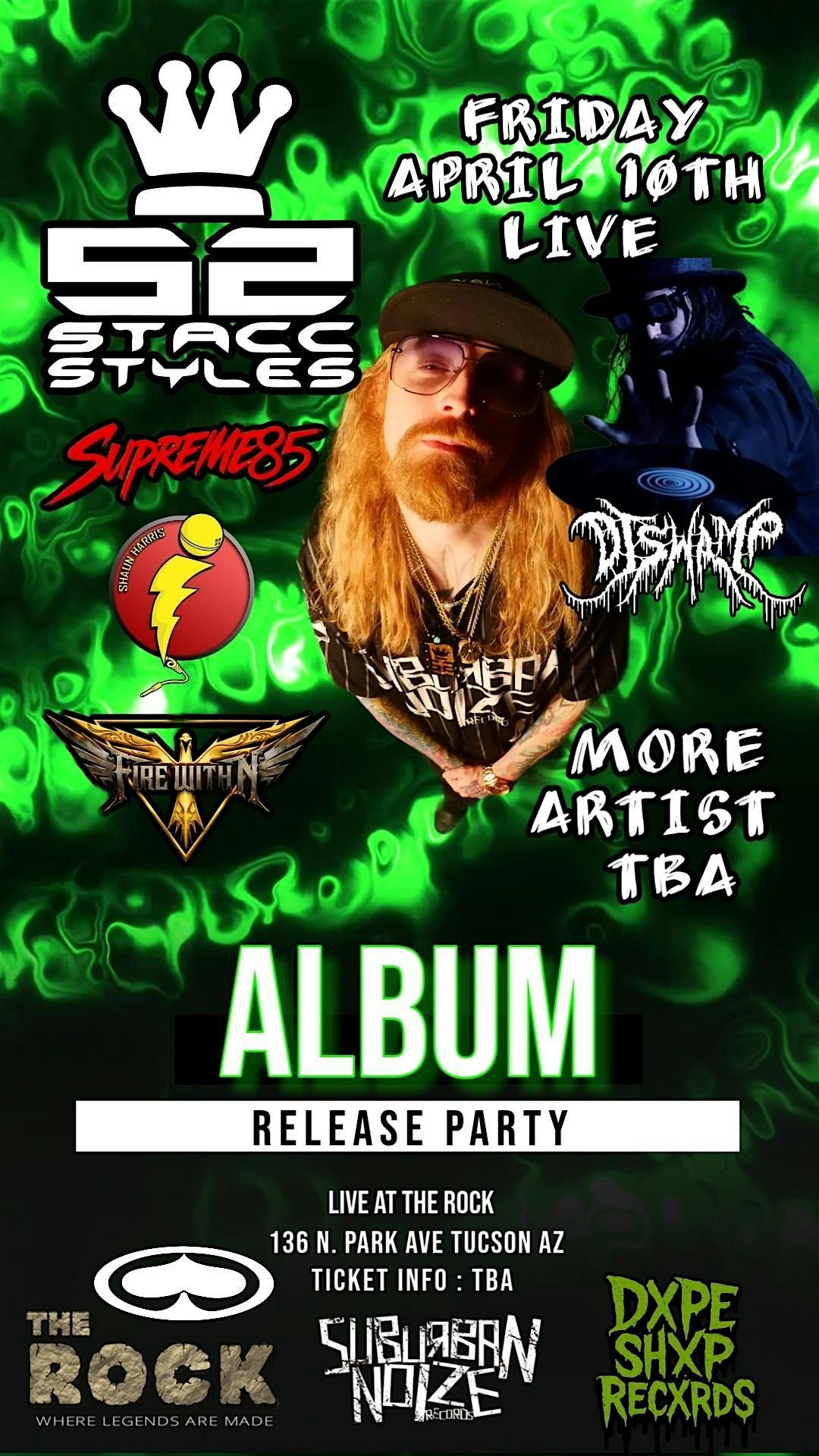 STACC STYLES ALBUM RELEASE PARTY FEATURING DJ SWAMP , SUBURBAN NOIZE RECORDS , SRH , DXPE SHXP RECXRDS AND MORE !!! WITH SPECIAL GUESTS SUPREME 85 , SHAUN HARRIS , APAULO 8 , FIRE WITHIN , EL MONSTA , TONY JAW , JERSE , DJ LOONEY AND MORE !!! LIVE AT THE ROCK ! NEW ALBUM AND NEW MERCH WILL BE AVAILABLE . ALL AGES SHOW , FRIDAY NIGHT APRIL 10TH LIVE AT THE ROCK 136 N PARK AVE TUCSON AZ . $13 PRE SALE $20 AT THE DOOR