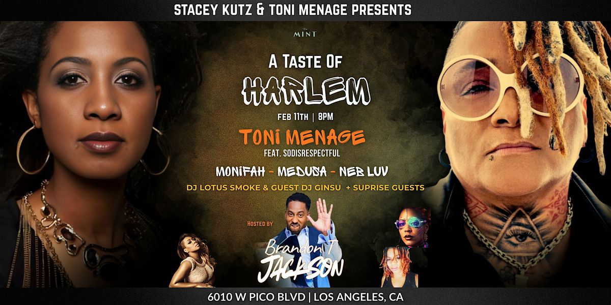 Stacey Kutz & Toni Menage Present: “A TASTE OF HARLEM” featuring Monifah, Medusa and Neb Luv! with DJ Lotus Smoke & Guest DJ Ginsu plus surprise guests. Hosted by Brandon T Jackson!