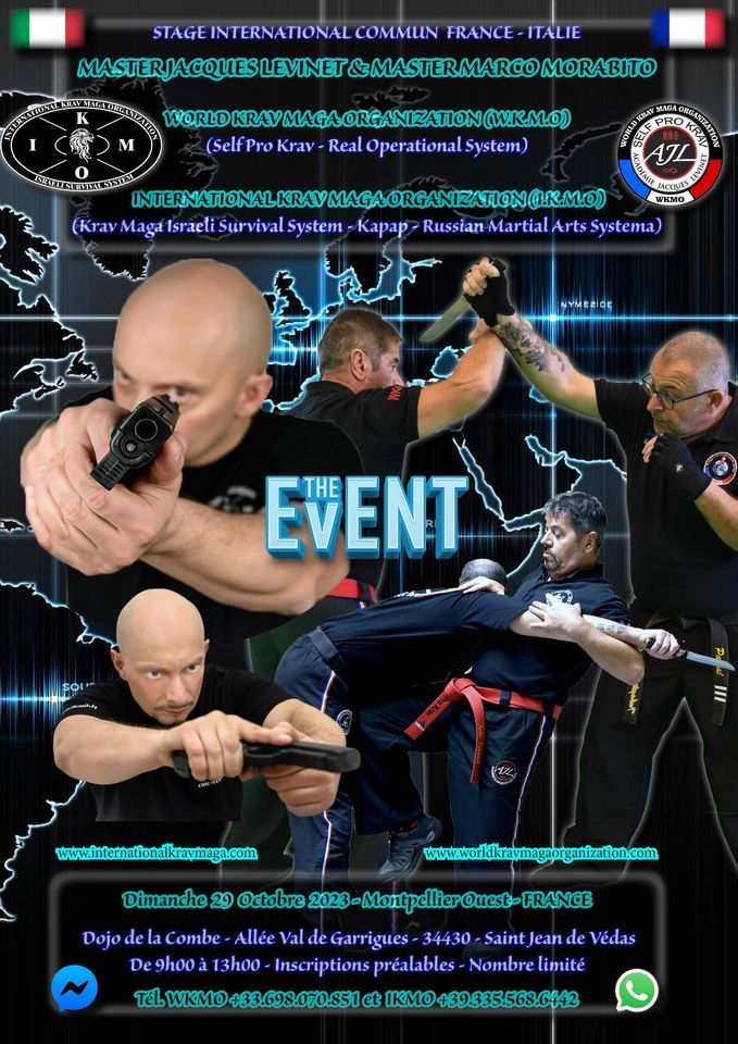 Stage commun de Kravmaga avec les Maîtres Marco Morabito et Jacques Levinet. Pré inscriptions obligatoires, nombre limité. [email protected] et Tél. Whatsapp+33698070851