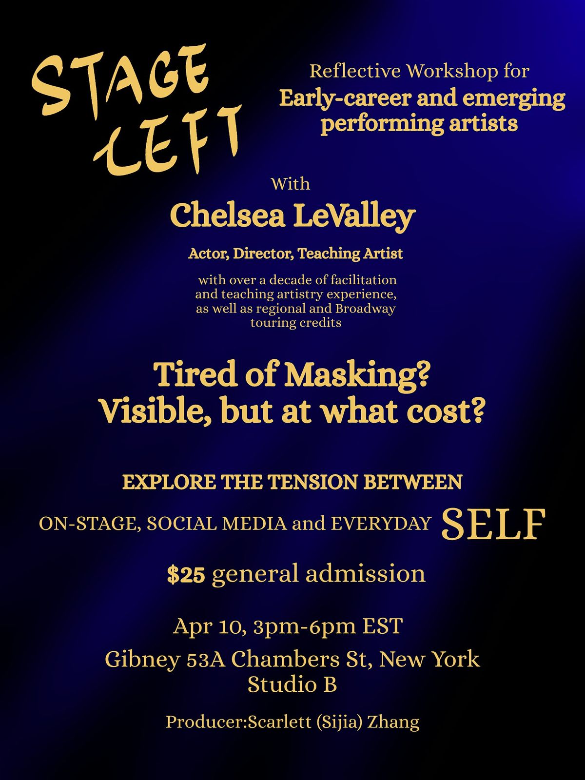 Stage Left is a reflective, interactive workshop for early-career and emerging performing artists exploring the tension between social media self, on-stage self, and everyday self. Through guided reflection, group discussion, and practical exercises, participants will have space to think about visibility, boundaries, self-presentation, and sustainability in creative life. This is not a therapy space, and sharing is always optional. Attendees can expect a warm, structured, community-based environment and leave with greater self-awareness, practical tools, and a clearer sense of how they want to navigate their artistic and everyday lives.