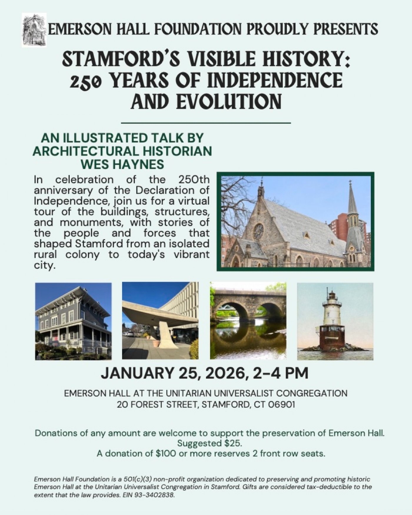 A Stamford native with a long career as a historic preservation specialist in the tri-state region, Wes Haynes studies historic places and works with their owners on how to adapt them to new uses and keep them in good repair. Today he continues to serve on many boards, lending his substantial knowledge to organizations like Emerson Hall Foundation, whose mission is to safeguard a 155 year old downtown church and honor its historic place in the community. Now known also as Emerson Hall, the Foundation seeks to provide a space for artists, musicians, and educators to gather, create, and share their work in the vibrancy of modern-day Stamford.