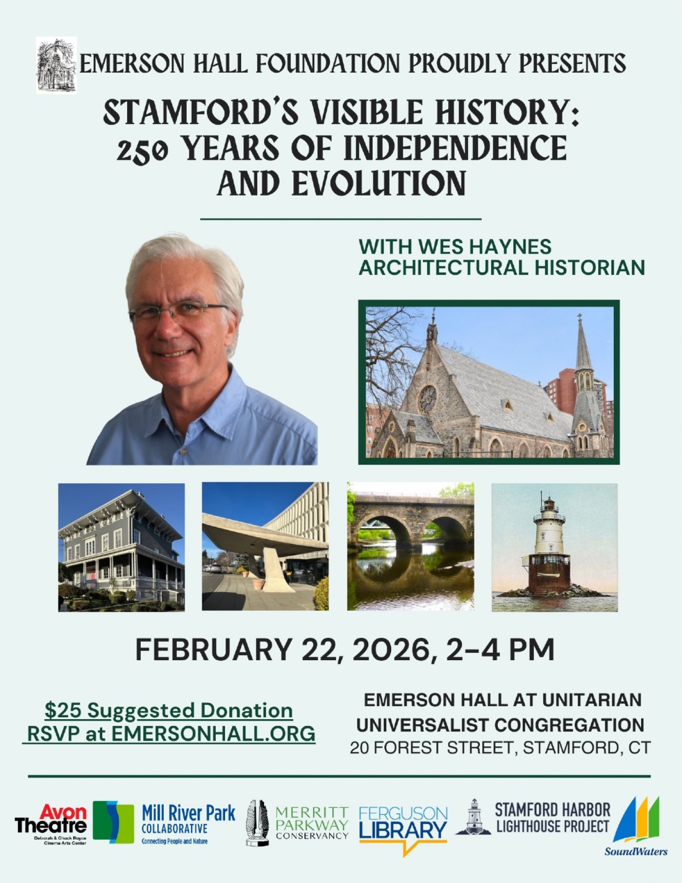 Sponsors: Avon Theater, Ferguson Library, Merritt Parkway Conservatory, Mill River Collaborative, Soundwaters, Stamford Harbor Lighthouse Project. Additional support from the Unitarian Universalist Congregation in Stamford.